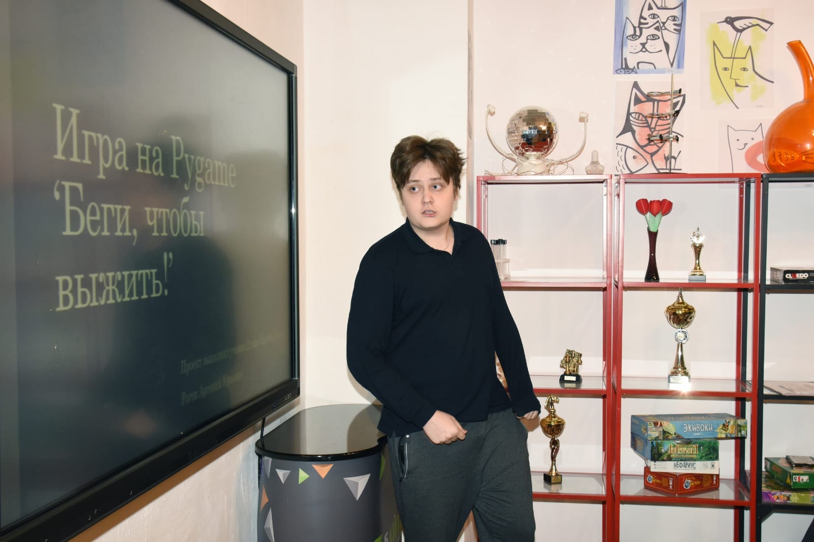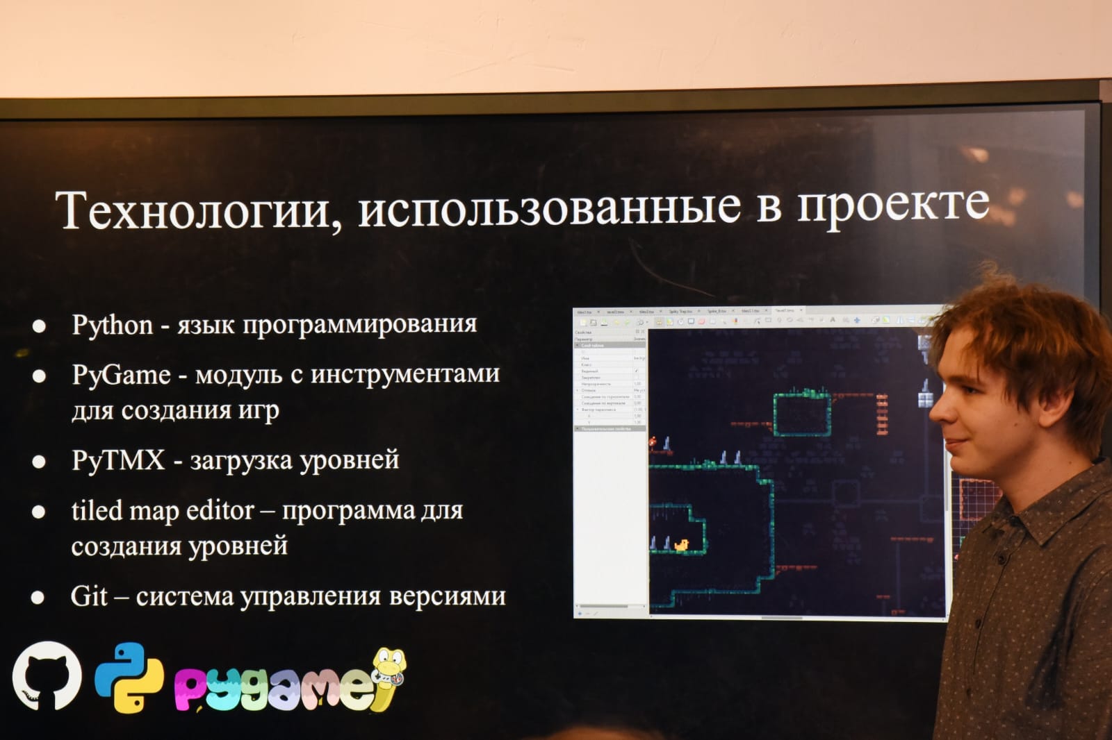 "Это мой персонаж, его задача убегать от падающих камней. Глыбы сваливаются на героя с разной скоростью. Задача: выжить! Эту игру я придумывал самостоятельно. Мне кажется, она может помочь расслабиться, отдохнуть и скоротать время!", - говорит Яндекс-лицеист Арсений Рогов, демонстрируя видео на экране проектора.